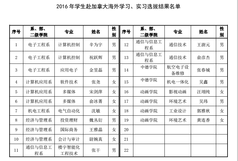 根据《上海电子信息职业技术学院2016年10月赴加拿大温哥华岛大学“学生海外学习、实习”项目实施方案》的相关要求,各相关系、部、二级学院在学生自愿申请的基础上,经过学科成绩审核、综合素质评分及面试等遴选程序后,共选拔产生19名学生。现将具体名单予以公示。如有异议,请在公示时间内向学院办公室反映。
