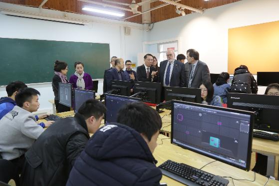 在学院党委书记、院长杨秀英、动画学院党支部书记、副院长施嘉斌和学院外事专管员姚一平的带领下,加方代表一行人参观了动画学院。动画学院学生实训室的建设、运行以及专业特色课程等各方面引起了加方代表的浓厚兴趣,他们纷纷驻足观摩、详细咨询。动画学院党支部副书记、副院长高晓昧和副院长周前程(挂职锻炼)等也在现场与加方代表进行了讲解和交流。参观结束后,在学院中德B楼307会议室学院党委书记、院长杨秀英、动画学院党支部书记、副院长施嘉斌等会见了加方代表,并就2017年中加合作项目的工作进行了磋商,不仅商谈了现阶段中加合作工作的重点,而且也探索了双方今后的合作方式。
