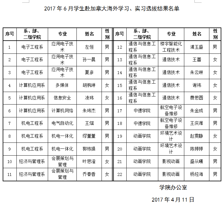 根据《上海电子信息职业技术学院2017年6月赴加拿大温哥华岛大学“学生海外学习、实习”项目实施方案》的相关要求,各相关系、部、二级学院在学生自愿申请的基础上,经过学科成绩审核、综合素质评分及面试等遴选程序后,共选拔产生22名学生。现将具体名单予以公示。如有异议,请在公示时间内向学院办公室反映。