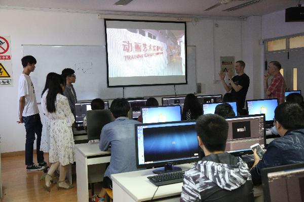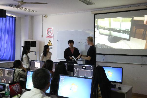 在洽谈的最后一天,Robin Davis教授,Doug Stetar教授与我院赵莹老师、2015级电脑艺术设计1班的同学们一起,呈现了一堂精彩纷呈的影视剪辑AE课程。课上,同学们分小组展示和讲解了自己拍摄、剪辑的视频作品,赵莹老师和两位教授在与同学们互动教学的过程中,不仅对同学们的作品给予了充分肯定,而且也向同学们指出了不足和改进的建议,同学们都获益匪浅。