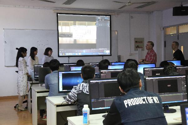 在洽谈的最后一天,Robin Davis教授,Doug Stetar教授与我院赵莹老师、2015级电脑艺术设计1班的同学们一起,呈现了一堂精彩纷呈的影视剪辑AE课程。课上,同学们分小组展示和讲解了自己拍摄、剪辑的视频作品,赵莹老师和两位教授在与同学们互动教学的过程中,不仅对同学们的作品给予了充分肯定,而且也向同学们指出了不足和改进的建议,同学们都获益匪浅。