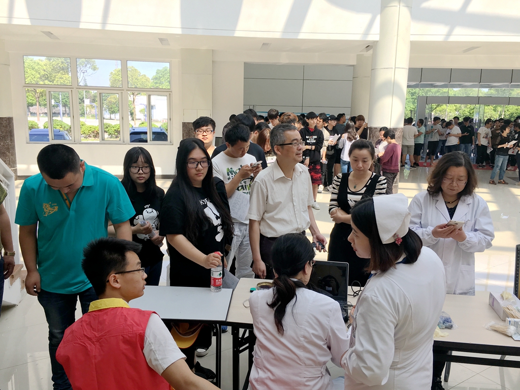 2017年5月17日,我校在图文信息中心一楼举行了大学生无偿献血活动。设计与艺术学院的同学们准时到达献血点等待献血流程的开始。设计与艺术学院党支部书记、院长施老师,党支部副书记、副院长高老师以及田老师、倪老师、马老师前往献血点关心学生的献血进程和身体状况。同学们有序进行献血的各流程,首先填表格刷身份证登记,然后进行抽验血,分析出同学的血型与健康状况,最后进行采血,采血结束后,学校志愿者们给献血学生准备了糖水,发放献血纪念品,提供细致贴心的服务。同学们积极配合老师与医务人员的工作,献血工作有条不紊地进行。无偿献血是拯救他人生命,是终身的荣誉,会得到社会的尊重和爱戴,无偿献血是无私奉献、救死扶伤的崇高行为。