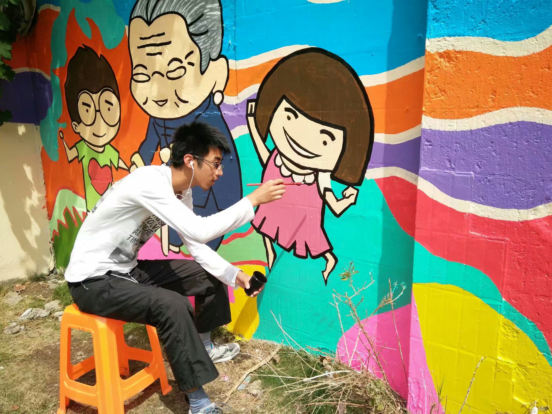 涂鸦彩绘的第一天,天气炎热不堪,但大家并没有受到天气带来的阻挠,大家兢兢业业的画着自己负责的板块的线条,之后的几天里大家开始了调色与上色。大家在调色前都会反复的确认外形和轮廓,希望把最好的作品呈现给路过的行人。