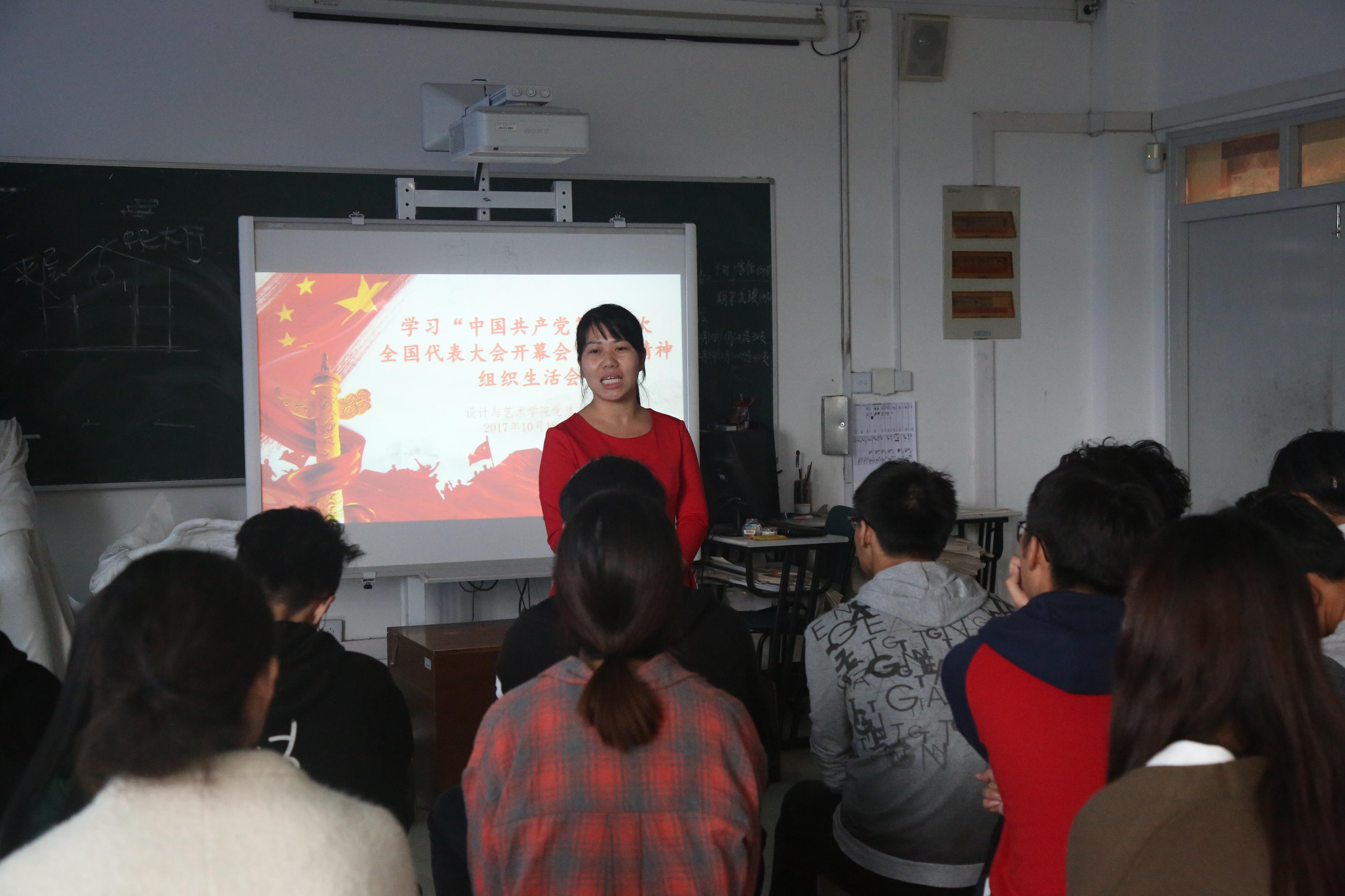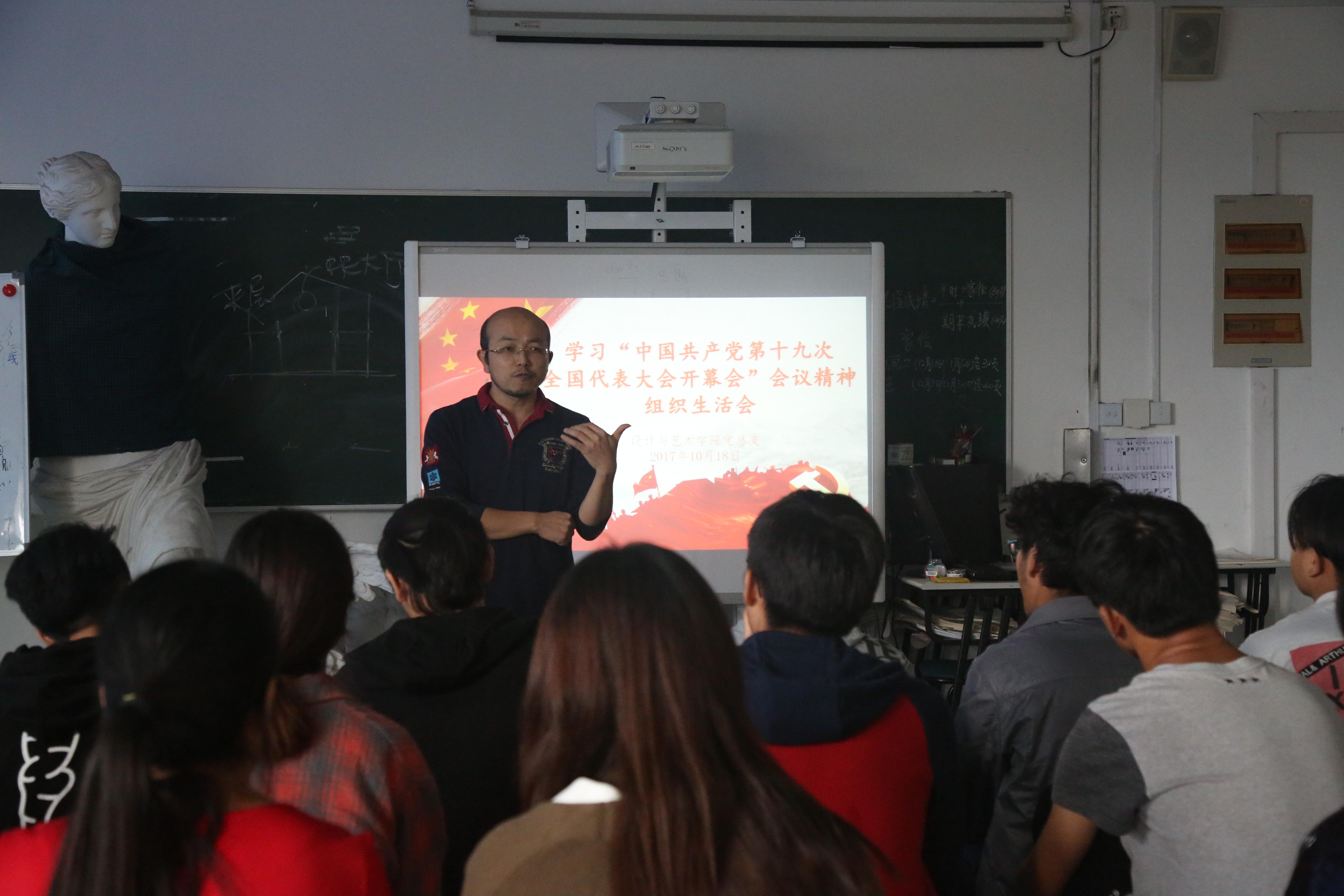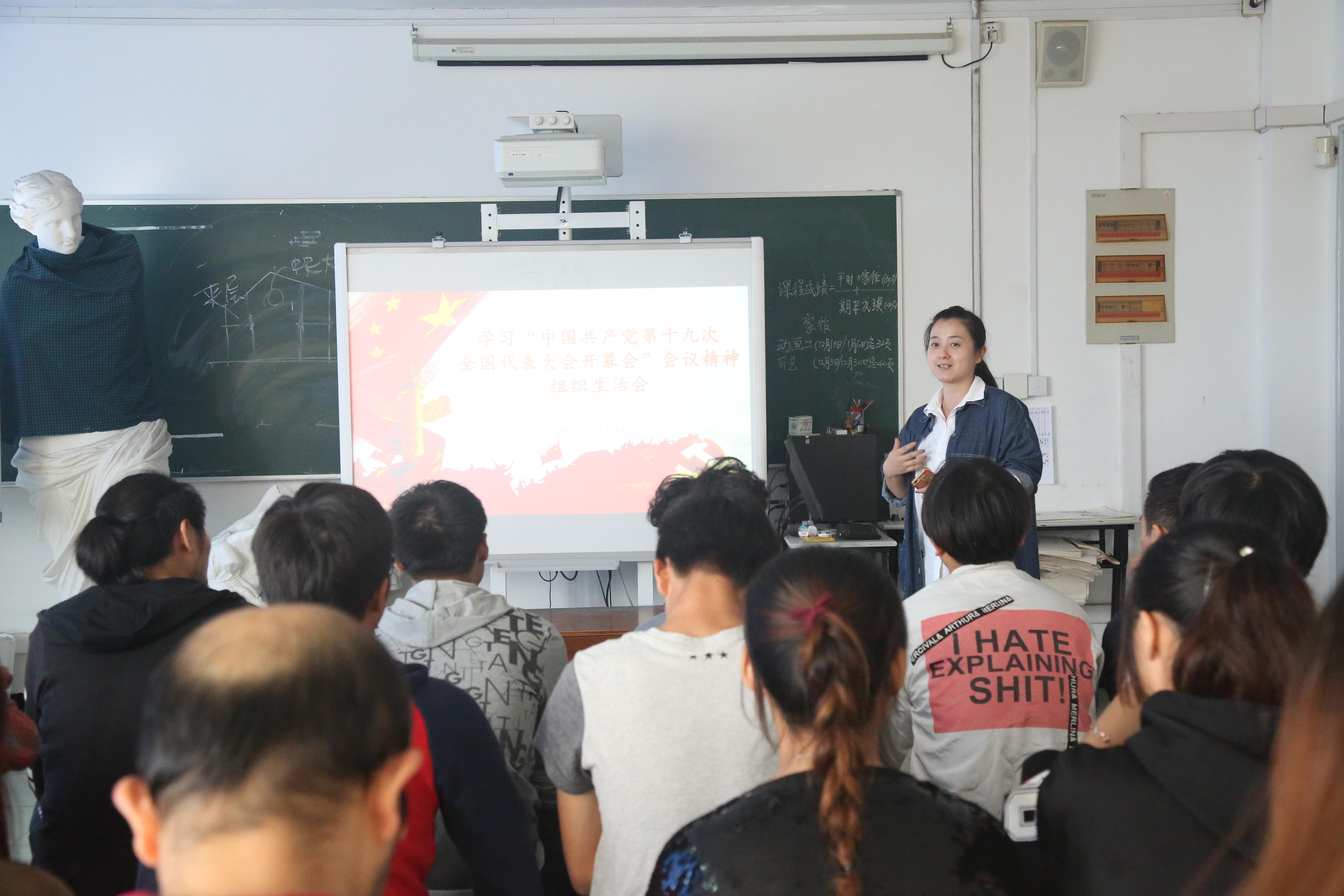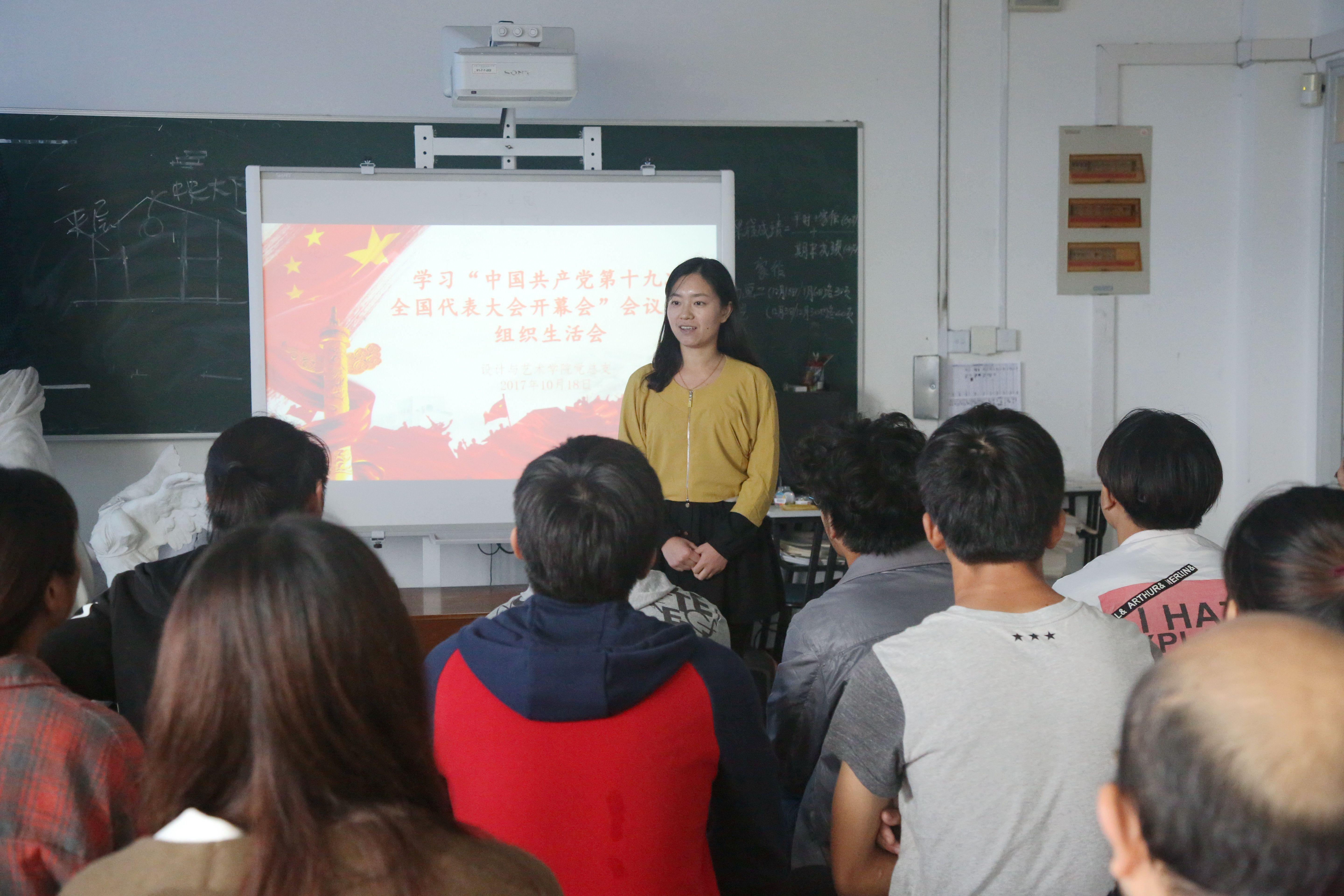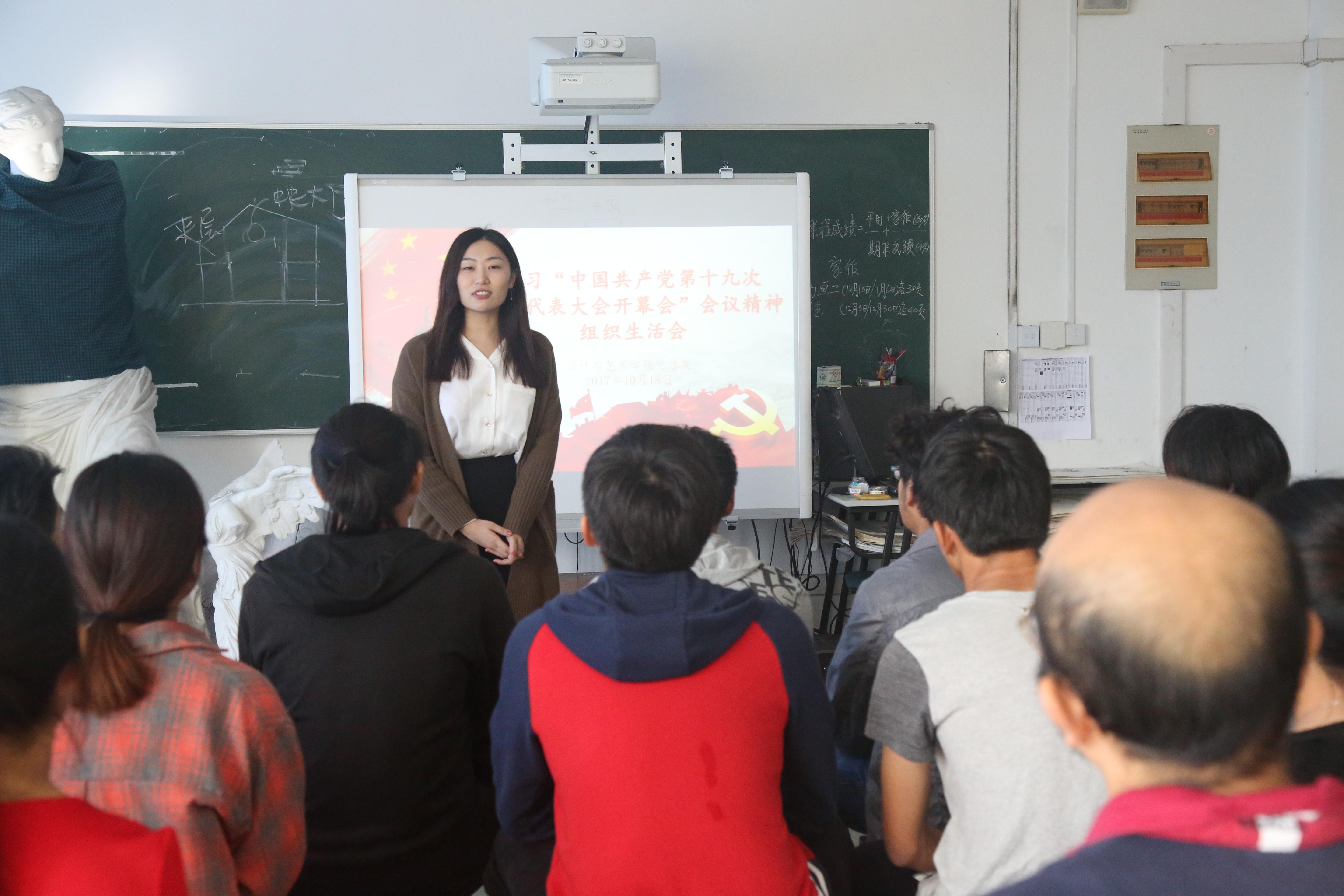 中国共产党第十九次全国代表大会开幕会结束后,设计与艺术学院党总支组织师生开展学习“中国共产党第十九次全国代表大会开幕会”会议精神组织生活会议,会议上教师代表和学生代表发表学习感想,切身感受到我国目前走入了新时代,国家从站起来到富起来再到强起来,坚定中国共产党领导下的伟大实践和巨大成果,师生们感慨美好,心存感激。教工代表表示:“我们在新时代背景下,要不忘初心、牢记历史,国家的繁荣富强来之不易,在国家的伟大目标的引领下,我们要从自身做起,做好本职工作,为社会主义现代化建设贡献力量。”学生代表表示:“我们的生活美满、家庭幸福离不开中国共产党的领导和实践,我们要牢记历史,勇往直前,以实际行动认真学习、开拓创新,以实际行动为社会主义现代化建设贡献力量。”