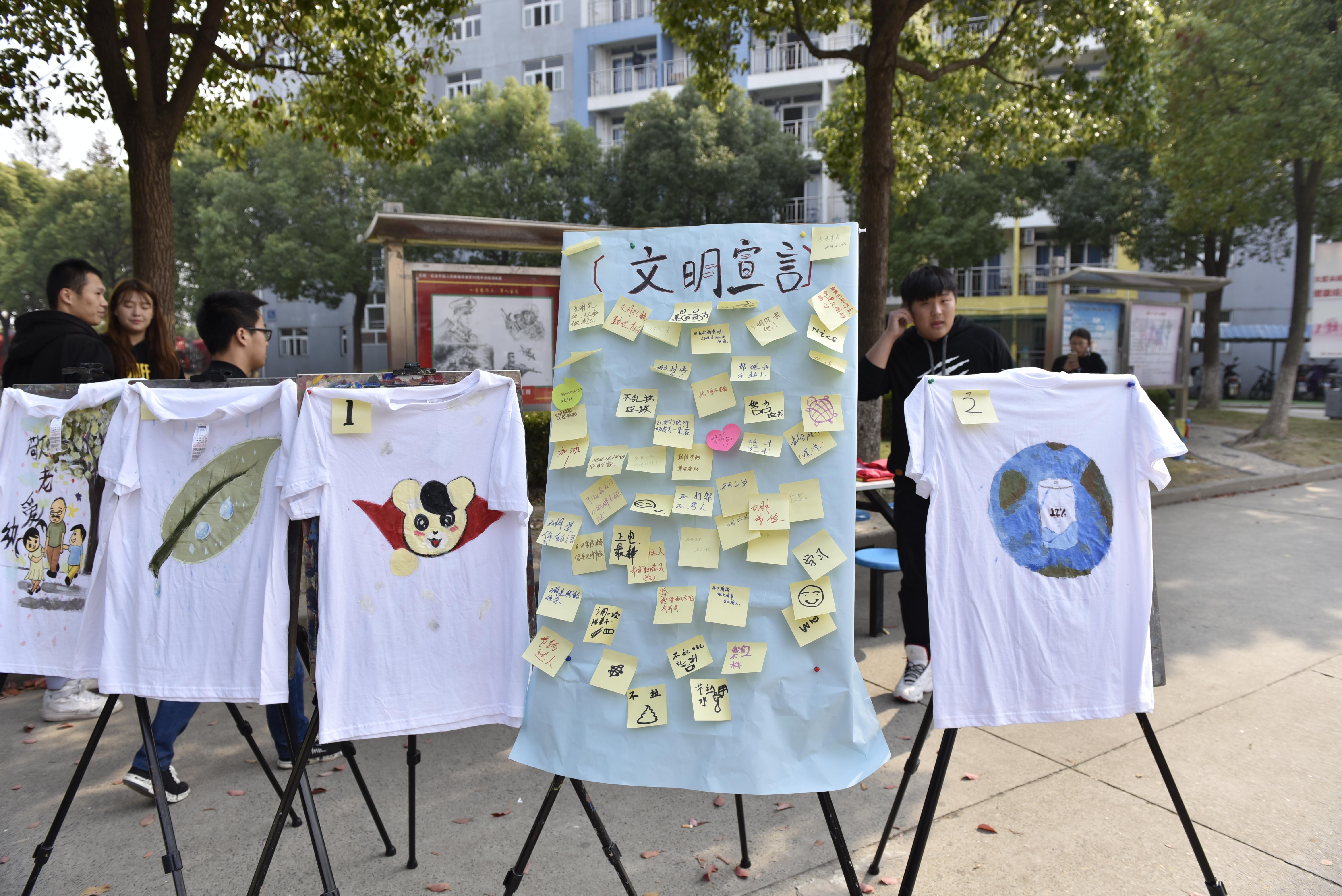 2017年11月8日上午10点至下午1点,设计与艺术学院团总支学生会在生活园区举行了文明校园彩绘T恤展览活动。活动以炫彩青春、文明先行、勤俭节约、尊老爱幼为宗旨,引领广大师生一起弘扬中华传统美德。