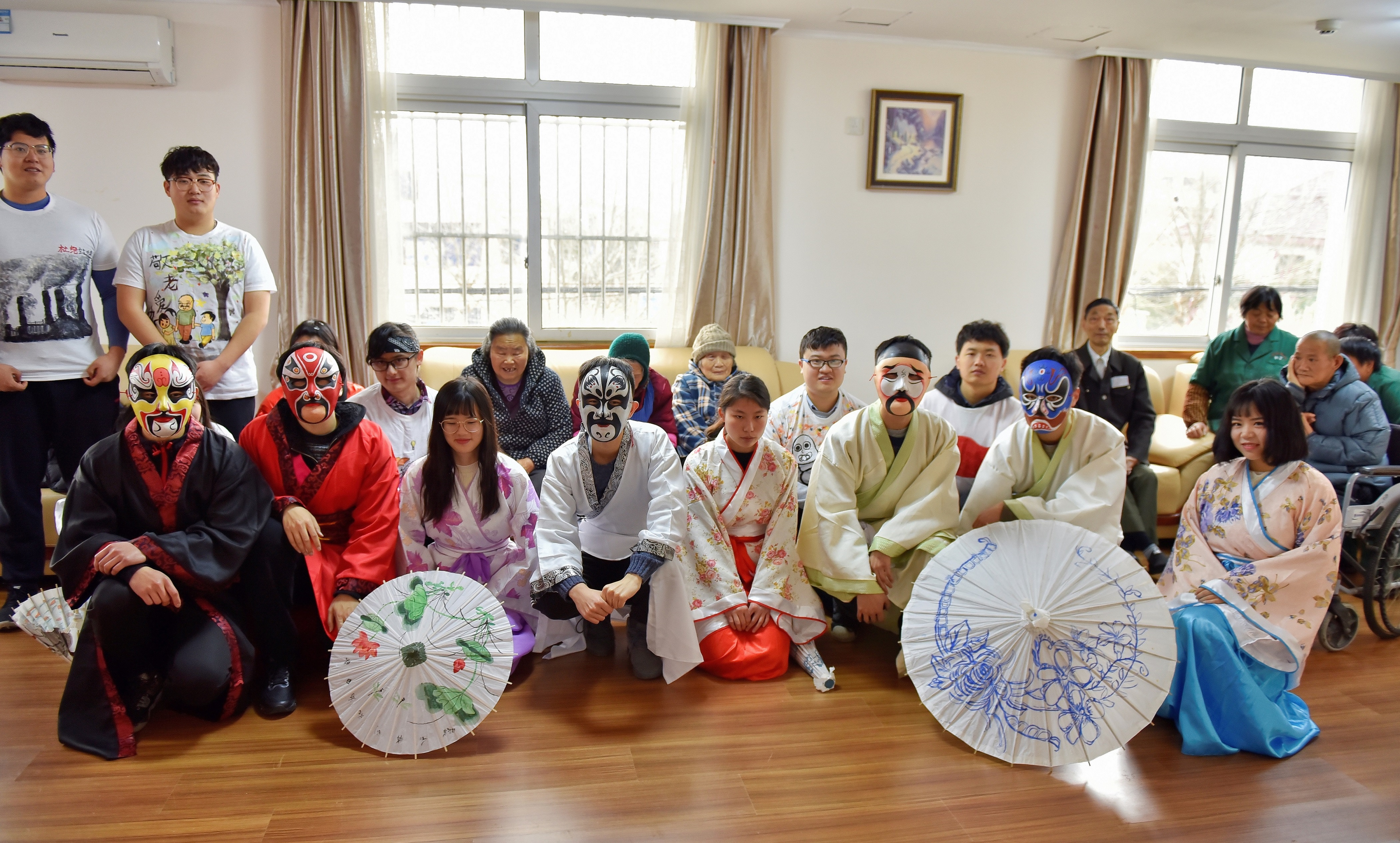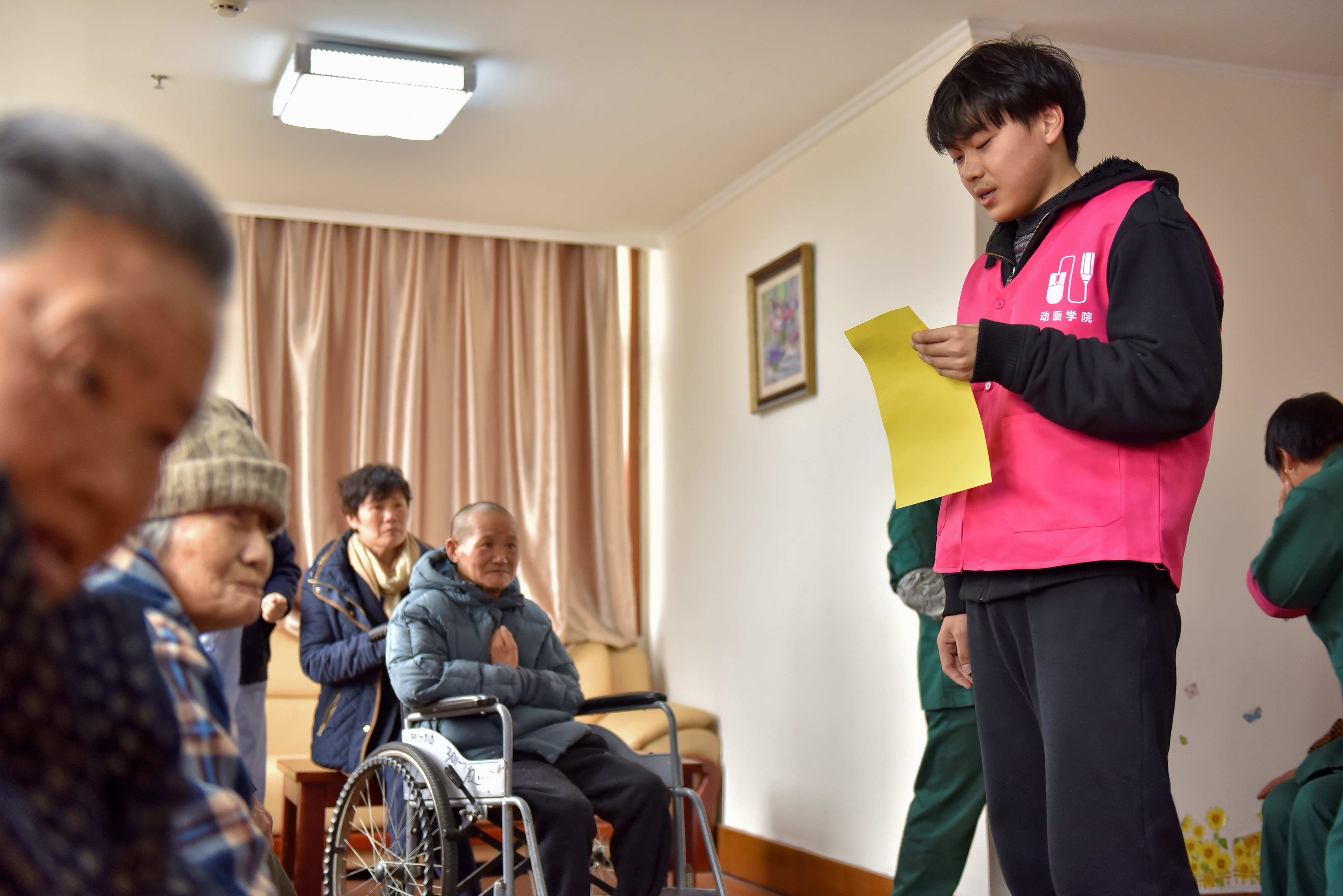 活动在护理院的接待厅举行,老人们很是高兴,主动要求前来接待厅,期待同学们的表演。志愿者们积极、热情地与老人们拉起了家常。了解了老人的姓名和生肖之后,表演正式开始了。第一个节目是为老人画生肖并赠送作品,甚是可爱的生肖狗、生肖鸡、生肖虎,逗得老人开怀大笑,老人们一边观看一边夸赞同学们的画。接着是服装走秀表演,有穿汉服打油纸伞的楚楚少女,有国粹文化代表的脸谱表演,还有青春洋溢的T恤走台,老人感到惊讶的是这些色彩丰富的服饰既然是学生自己制作的,不禁竖起大拇指。紧接着是上海市华“白玉兰”绘画比赛,评选出最美白玉兰赠送给老人,表达真挚的关爱和敬爱之情。还有易班小熊绘画比赛,这是老人们觉得最可爱的作品,我们的志愿者为老人介绍易班小熊的寓意,易班是大学生学习、生活、文化娱乐不可或缺的互动平台,老人听着频频点头。节目很丰富,也很精彩,后面的《致老人的一封信》节目很是感人,老人们动之以情,感到了青年人的孝道和朝气。最后是由全体成员带来的大合唱《明天,你好》,活动在欢乐的歌声中圆满结束。