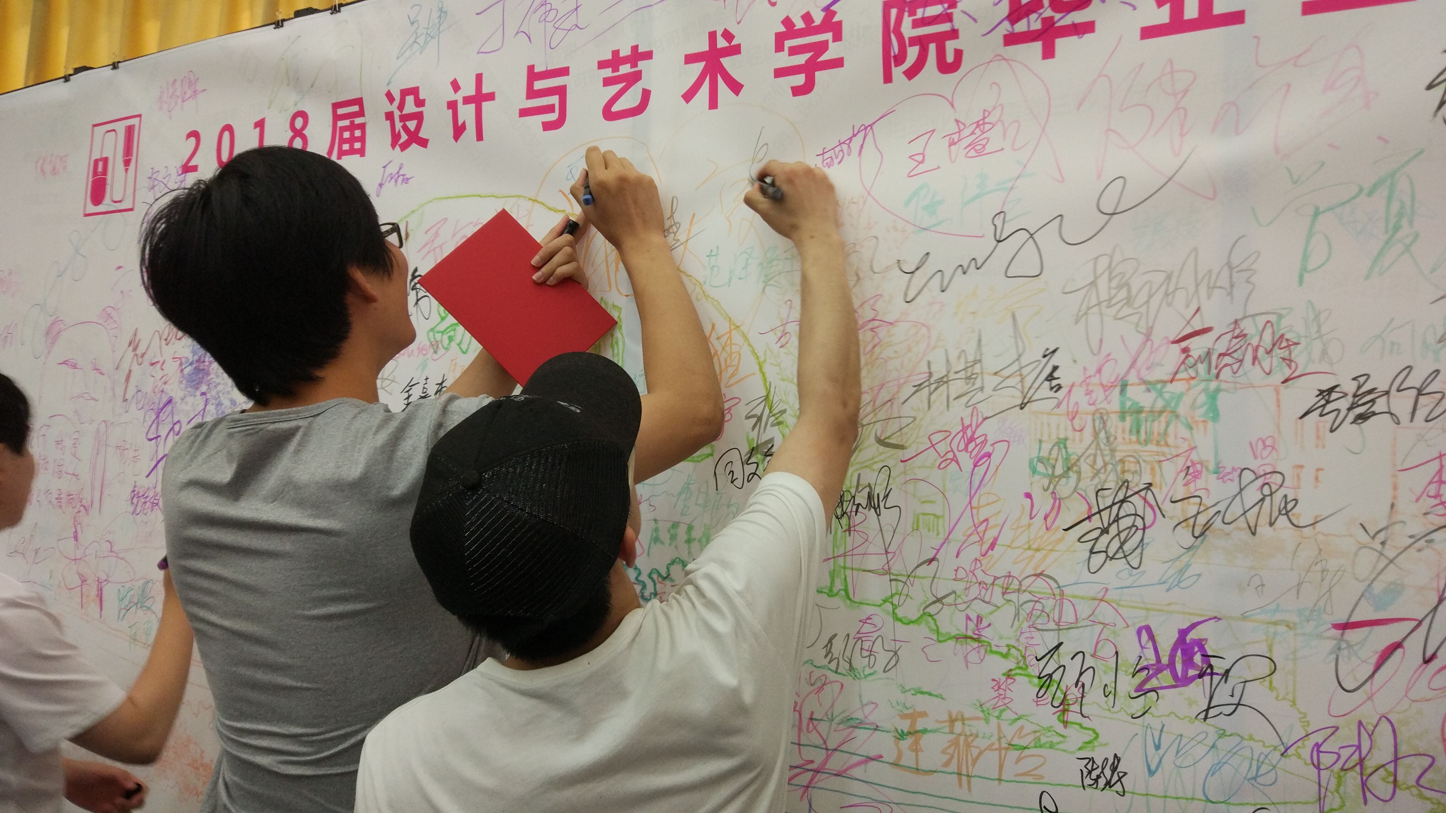 最后,在王静芳老师宣布2018届毕业典礼结束后,《祝你一路顺风》响彻全场的同时,同学们纷纷来到毕业生签名墙前留下了自己的签名,并将自己对母校祝福卡片订在在了留言板上。