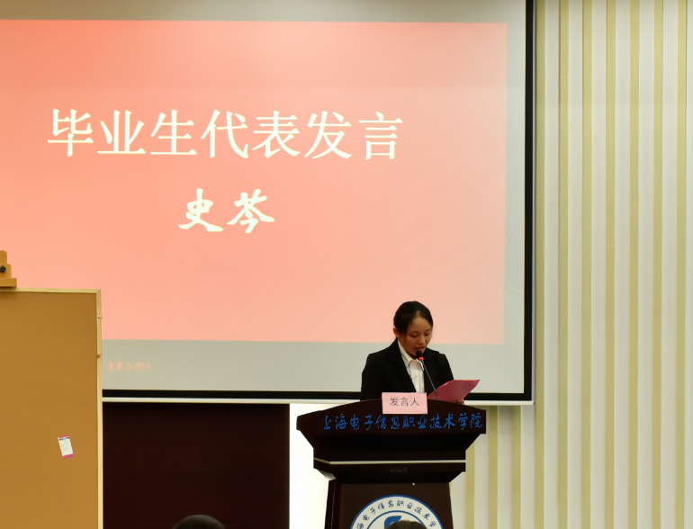 毕业典礼在雄壮的国歌声拉开序幕。上海市优秀毕业生史芩同学代表全体毕业生用声情并茂的语言,道出了全体毕业生依依不舍的心声;张沪生老师代表全体老师表达了对同学们的眷恋之情和深深的祝福;企业兼职教师代表沈赳赳老师代表企业教师,向全体毕业生送上真挚的祝福,表达了企业老师们张开双臂迎接毕业生的加入,一起成为“小猪佩奇”的期望。