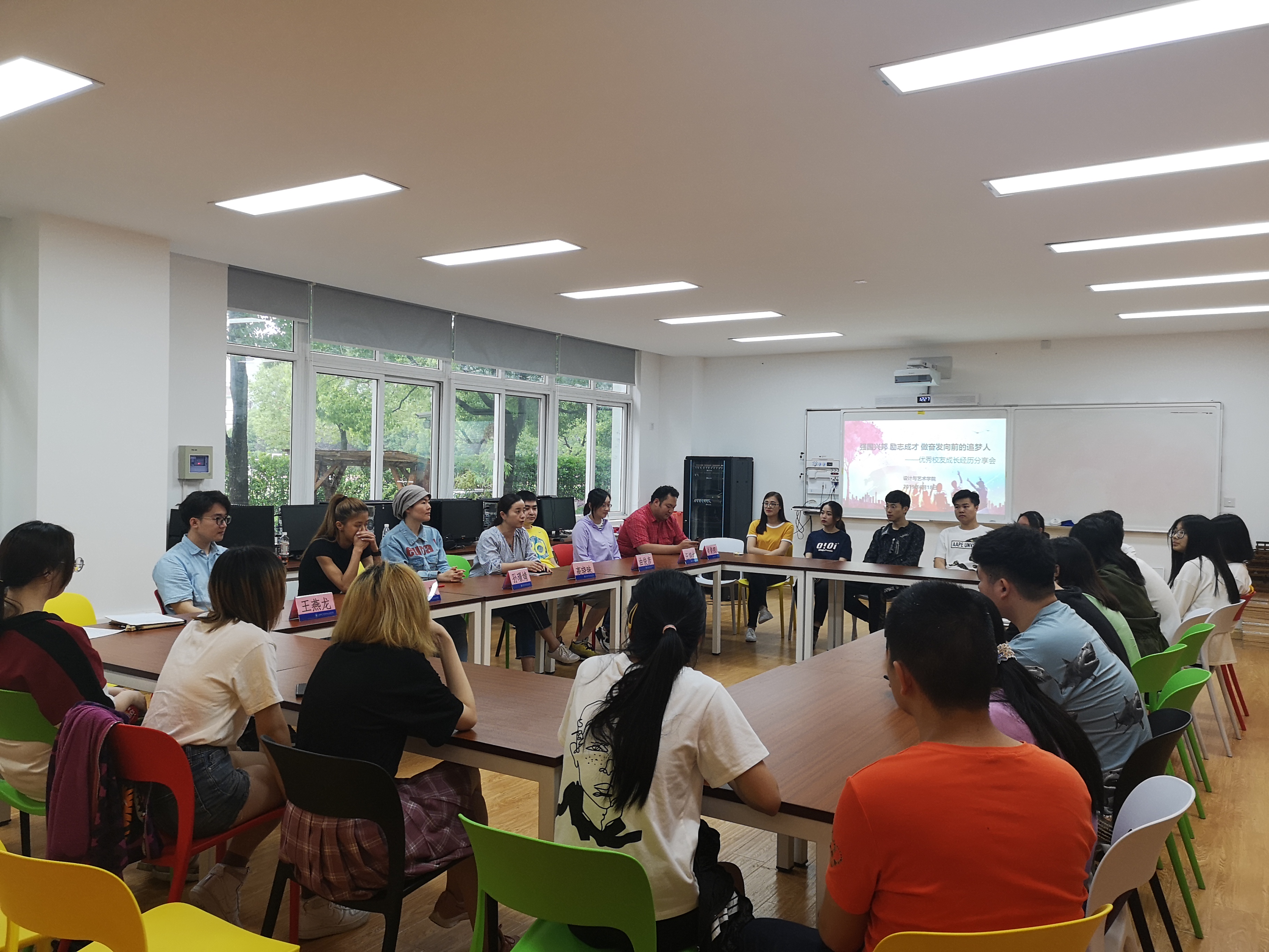 孙璟婧,我院 2010届优秀毕业生,现任缔创(上海)装饰建筑有限公司高级室内设计师,结合自己的求职及晋升经历,畅谈了自己工作中始终保持认真踏实、不断学习工作态度的体会;刘康,2011届优秀毕业生,现任Phic art lab 沙画工作室创始人,分享了自己从入校开始就通过多种途径从事艺术与设计类专兼职工作以及她与沙画结缘,坚持沙画梦想,最终创业成功的成长故事;曲俊彦, 2011届优秀毕业生,现任腾讯大申网高级视觉设计师,通过分享自己如何在腾讯获得奖项分享了专科学生在大型企业的成长成才的生存之道;肖俊凯,2011届优秀毕业生,现任设艺学院教学管理办公室主任,分享了工作中要有责任心,有目标,有想法的工作体会;汪翊纯,2018届优秀毕业生,就自己专升本的经历及进入本科阶段后的学习体会进行了分享;王燕龙,2018届优秀毕业生,现任上海微课信息科技有限公司项目主管,分享了自己初入职场后,始终坚持自己的奋斗目标,不懈努力,一年内得以连升两级的感悟。后各优秀校友还就如何在课余时间培养广泛兴趣爱好,如何积累人脉资源,如何始终培养自主学习能力及如何保持健康的体魄等方面内容与同学们进行了交流。