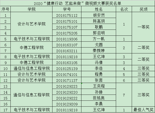 根据《5.25心理健康月“齐心战‘疫’,共话成长”系列活动——“健康行动艺起来做”微视频制作大赛通知》要求,经过各二级学院初赛、设计与艺术学院承办举行决赛,最终决出最终名次奖项,现予以公示。