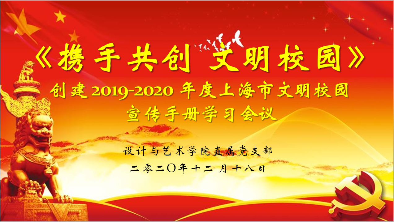 为学习贯彻党的十九大精神,进一步将培育和践行社会主义核心价值观落细、落小、落实,使各级各类学校的文明创建工作进一步规范化、制度化、常态化,发挥教育系统文明校园在提升城市文明程度过程中的示范引领作用,按照全国文明校园创建工作推进会精神和上海市精神文明建设委员会办公室的相关工作要求,2020年12月18日设计与艺术学院教师们相聚云端,在高书记组织下,王晓老师的带领下,深入学习《携手共创 文明校园》创建 2019-2020 年度上海市文明校园宣传手册。