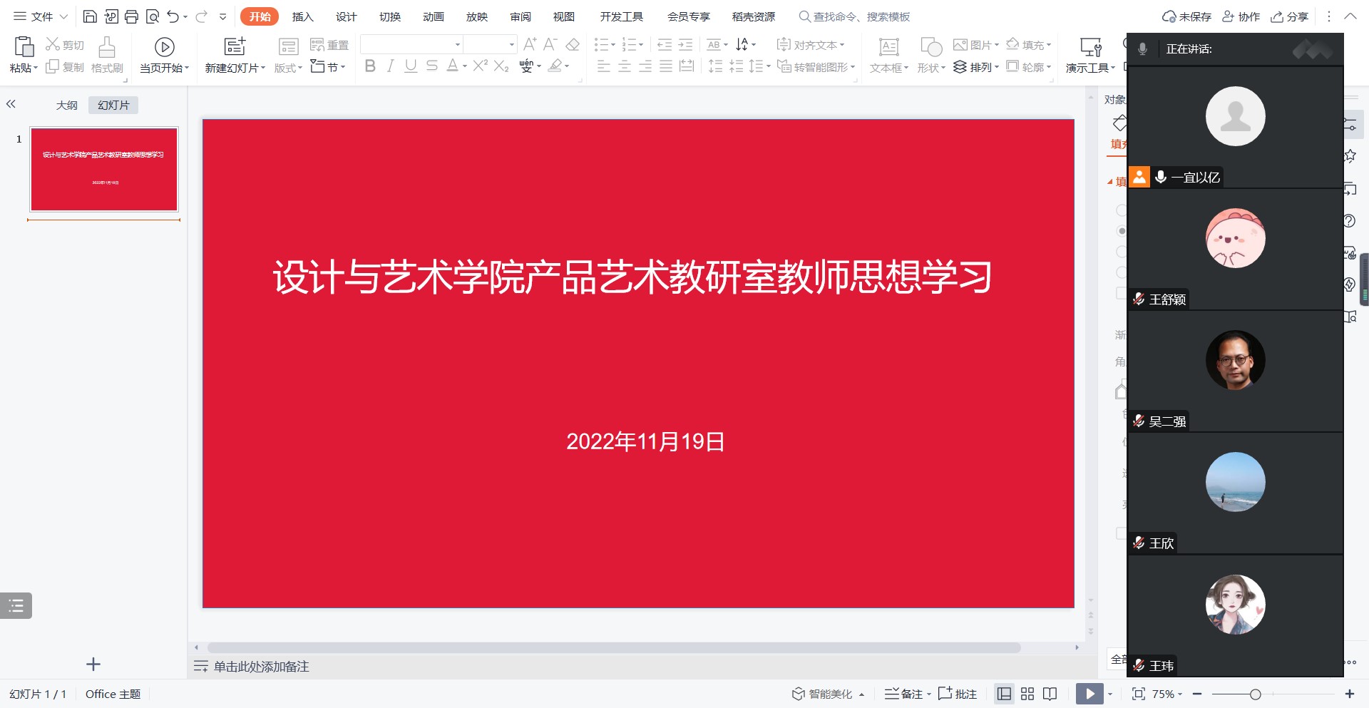 为全面准确深入宣讲党的二十大精神,落实师德师风第一标准,着力建设政治素质过硬、业务能力精湛、育人水平高超的高素质教师队伍,2022年11月,设计与艺术学院教师线下和线上同步学习《高举中国特色社会主义伟大旗帜为全面建设社会主义现代化国家而团结奋斗——在中国共产党第二十次全国代表大会上的报告》、《中国共产党第二十次全国代表大会关于十九届中央委员会报告的决议》、《中国共产党章程》和《中国共产党第二十次全国代表大会关于《中国共产党章程(修正案)》的决议》文件学习。学习领会二十大报告所蕴含的精神实质和丰富内涵,深刻理解其历史洞察力、理论引领力、实践指导力,切实把学习成效转化为做好各项工作的强大动力,并就学习文件进行了逐一学习和研讨交流。
