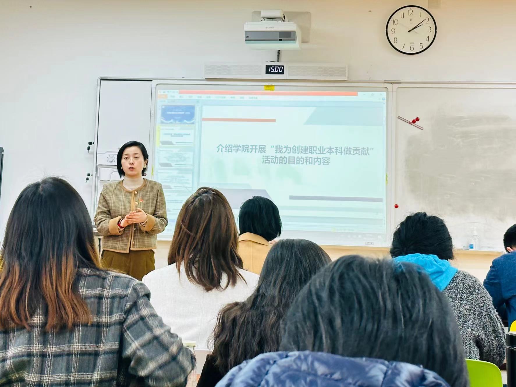 为统一思想,提高认识,立足自身岗位,思考规划,更好地聚焦各项中心工作,助推学校职业本科建设发展,3月27日下午,设计与艺术学院全体专任教师、辅导员在ZDE106举行“我为创建职业本科做贡献”大讨论活动。根据教师工作部安排,工会王而平老师出席活动会议,会议由设计与艺术学院党总支书记高晓昧主持。