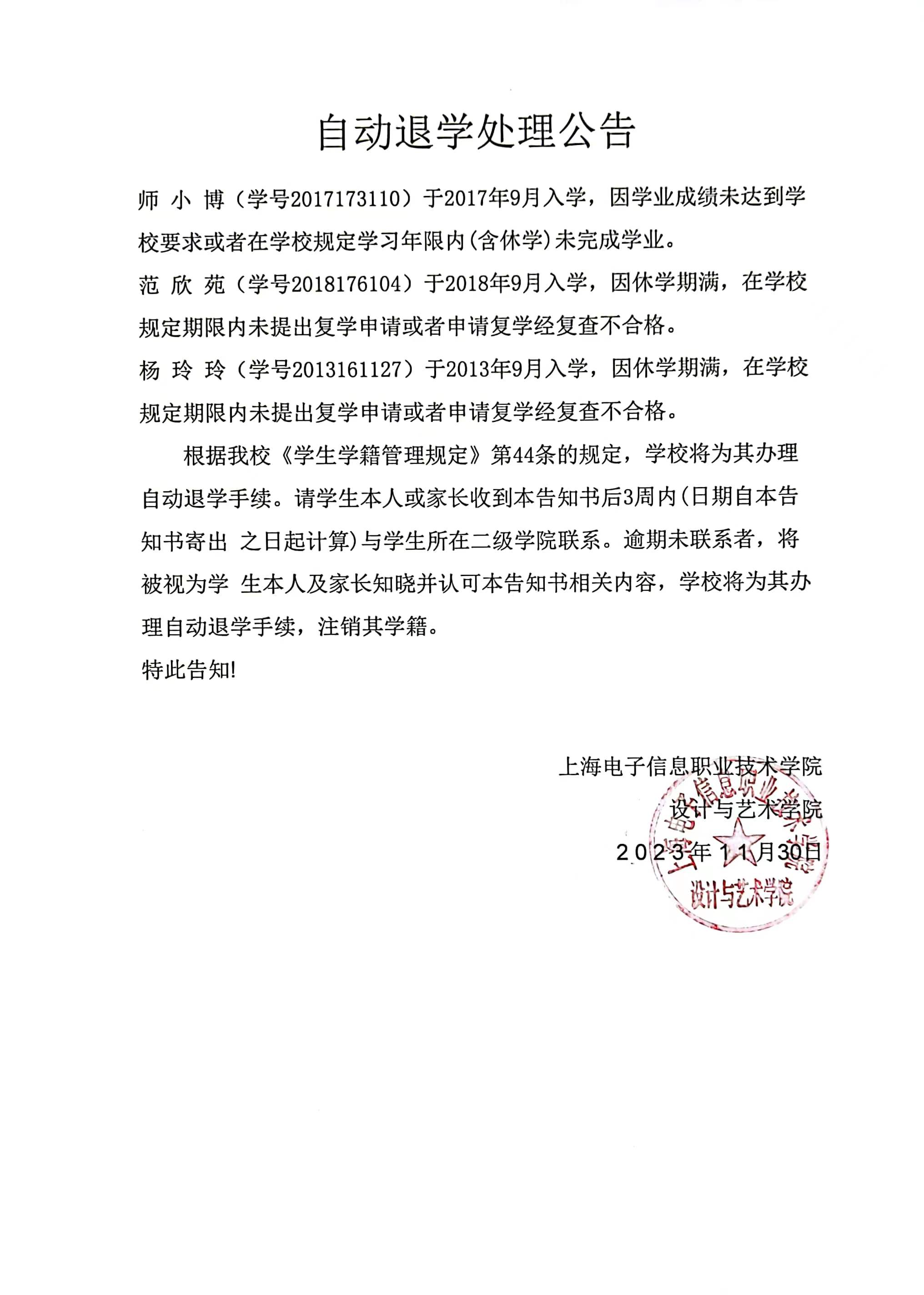 师小博、范欣苑、杨玲玲3位同学自动退学处理公告