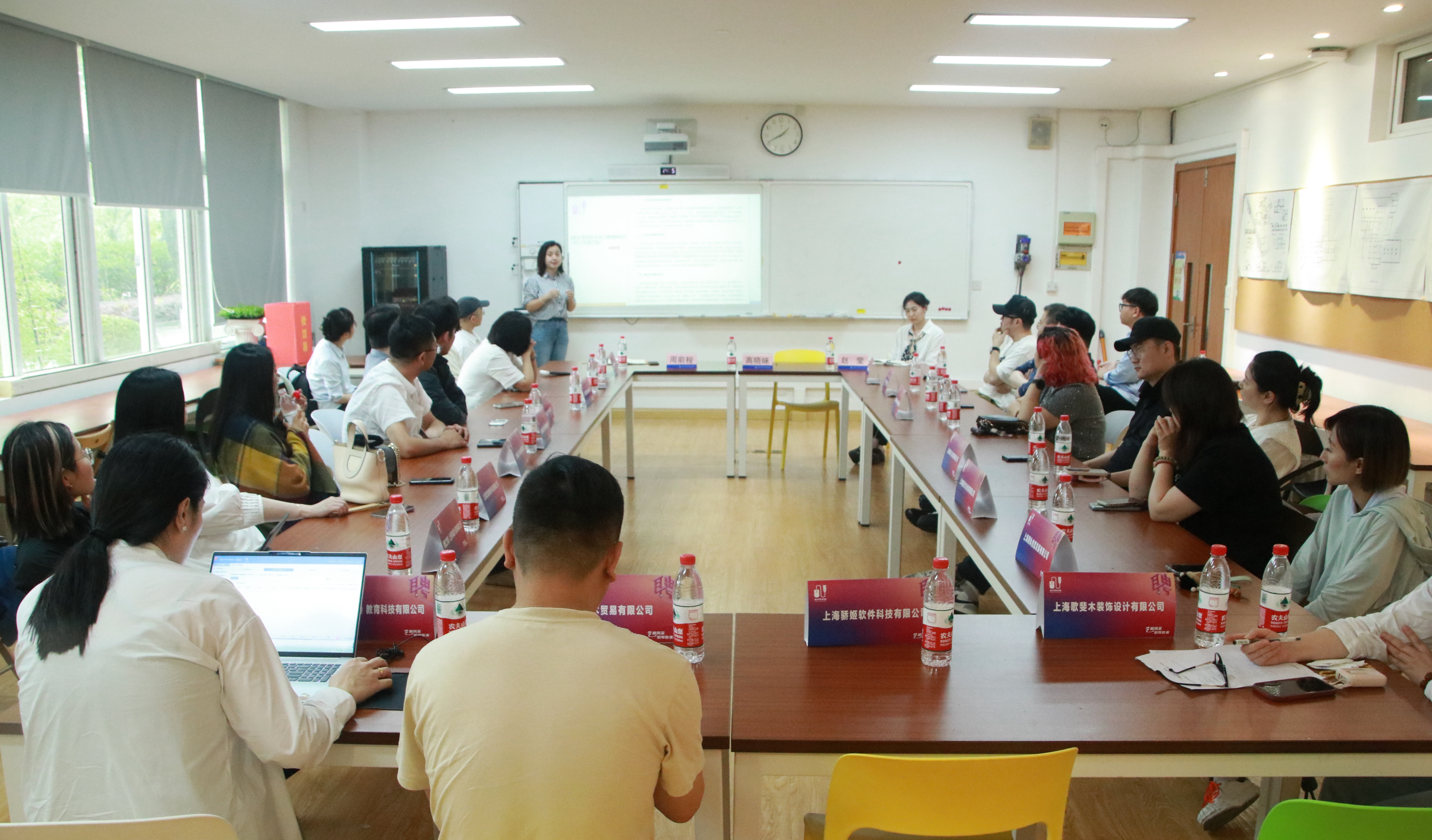 招聘会后,设艺学院于E106召开了校企合作座谈会,会议由高晓昧主持。高晓昧对校企合作协议、三方协议、实习管理等方面进行了相应解读,周前程、赵莹分别对学院的人才培养、社会服务进行了介绍。用人单位进行了交流发言。上海闽龙实业有限公司办公室主任、人事行政部总监、妇联主席范凤萍详细介绍了公司情况,对我院人才培养模式表示充分肯定,并向我院各专业毕业生实习就业投来橄榄枝。上海点晴信息科技有限公司、上海艺趣网络科技有限公司等负责人也在现场交流了用人意向和合作方向。
