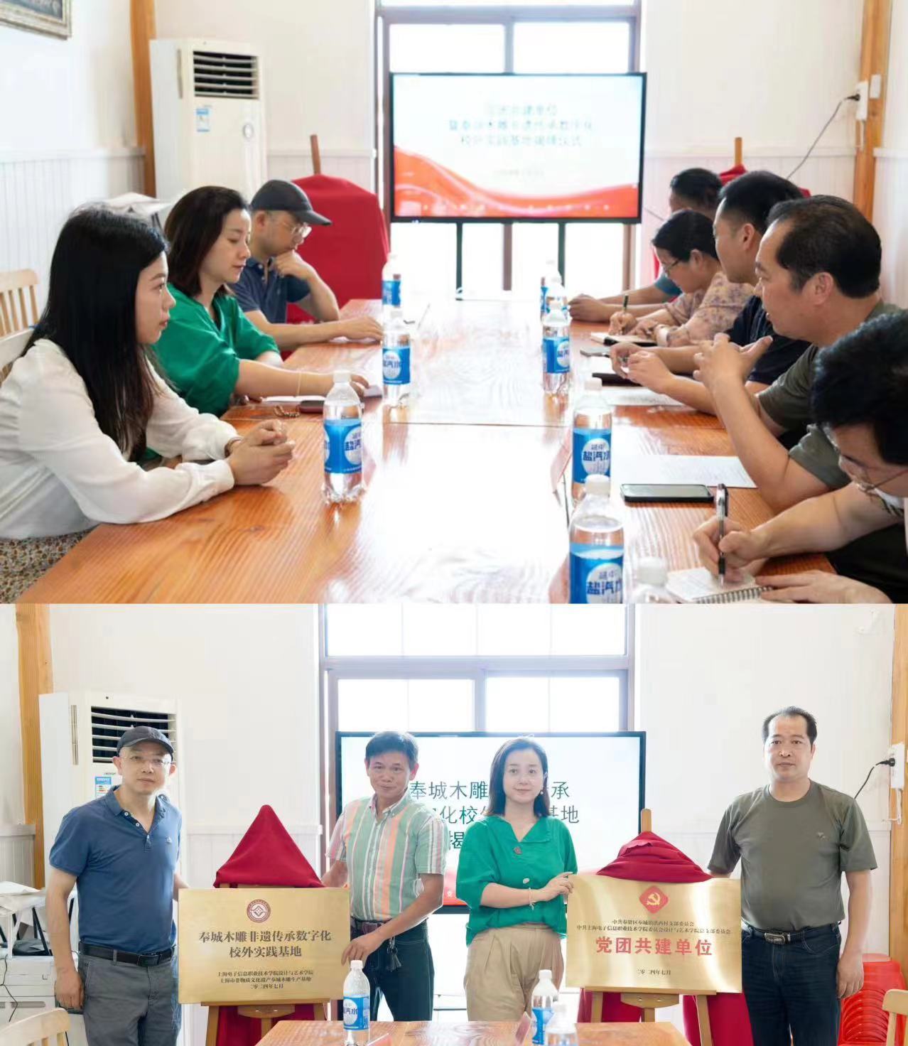 7月9日,设计与艺术学院党总支与奉城镇洪西村党支部开展党团共建活动暨上海奉城木雕非遗传承数字化校外实践基地揭牌仪式。奉贤区奉城镇洪西村第一书记王强,党支部书记周雪原,奉城木雕上海市级非遗传承人徐华兵,设计与艺术学院党总支书记、副院长高晓昧,设计与艺术学院副院长周前程,团总支负责人樊冬艳以及设艺学院学生代表参加活动。会议由洪西村第一书记王强主持。