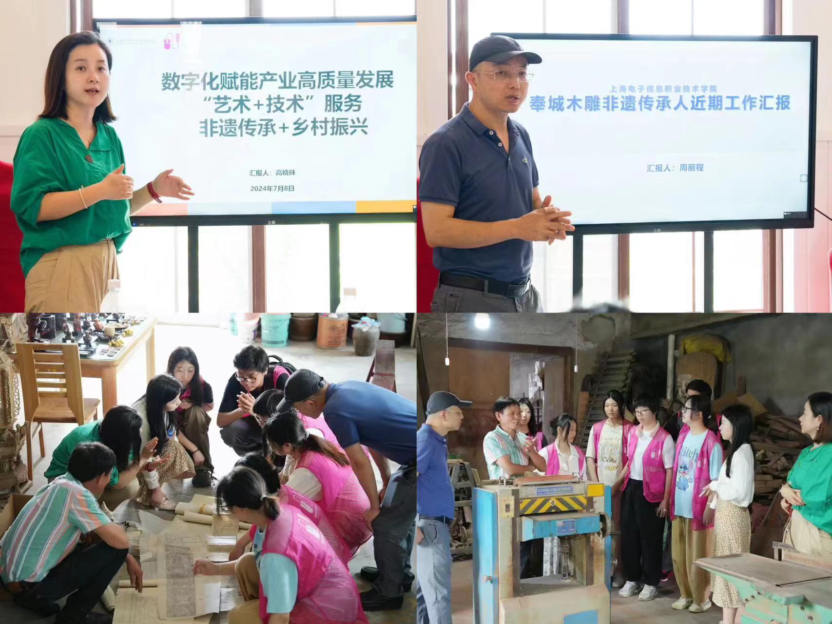 周雪原介绍了洪西村乡村振兴的相关内容以及发展需求。高晓昧介绍了设艺学院师生近年来服务乡村振兴、助力非遗传承工作情况,表达了希望能够在此前非遗传承合作多年的基础上,继续充分发挥学校的人才优势和科研力量,深入挖掘乡村的红色文化和非遗文化内涵。通过数字化赋能产业高质量发展,以“艺术+技术”、文化和科技融合的形式推动乡村振兴和非遗传承。周前程介绍了学校“奉城木雕非遗传承人工作室”已开展的工作,展示了木雕作品、文创作品等,并表示将充分发挥其传承非遗、助力文化振兴的作用,将非遗文化价值、技艺智慧和工匠精神融入青年学生的教育当中。
