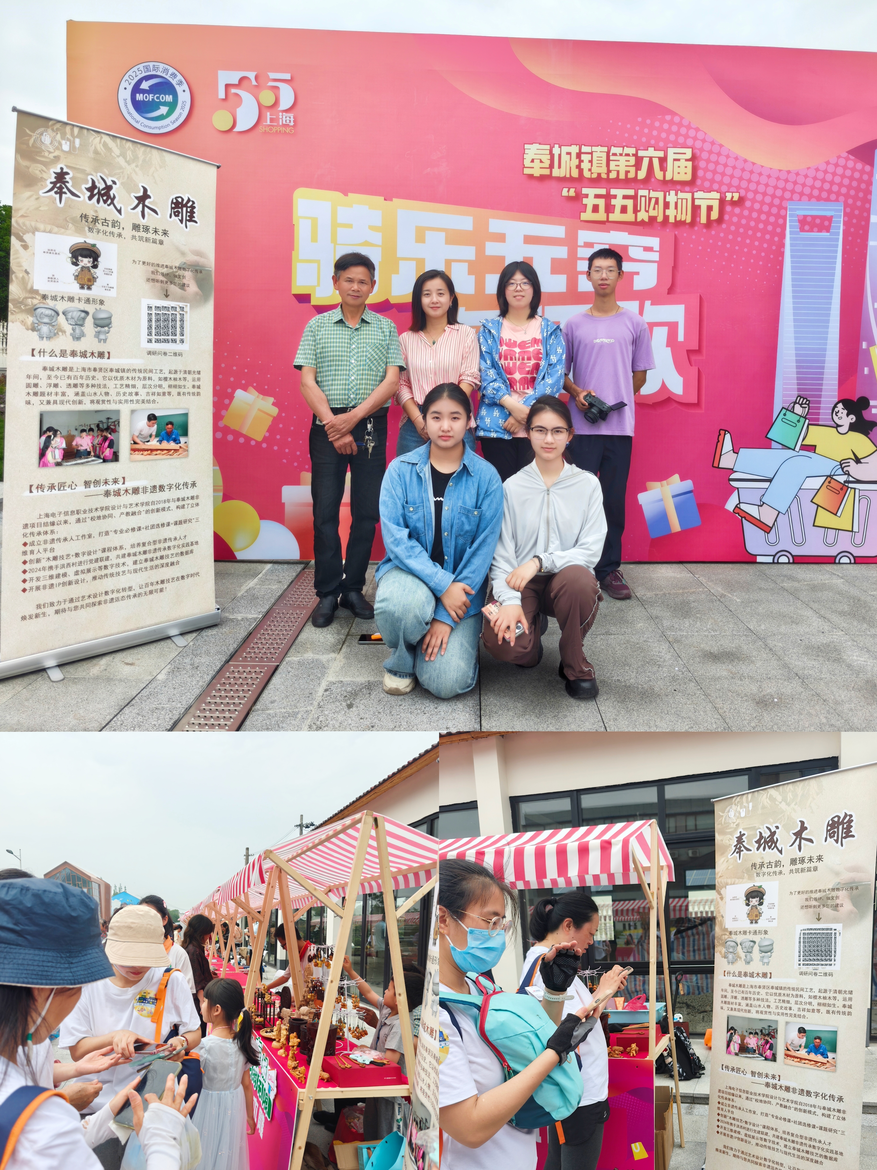 在非遗木雕展示过程中,设计与艺术学院与奉城木雕传承基地开展合作。学院党总支书记、院长高晓昧带领学院学子发挥专业特长,与上海市奉城木雕非遗传承人徐华兵老师协同,从摊位设计到木雕文创产品宣传推广进行展示。“奉城木雕卡通形象”首次展示于集市,受到了奉城镇相关领导的肯定,与木雕艺人、游客及当地居民广泛交流,围绕非遗数字化传承、产品创新等维度开展调研,收集一手资料,为奉城木雕产业发展提供数据参考。