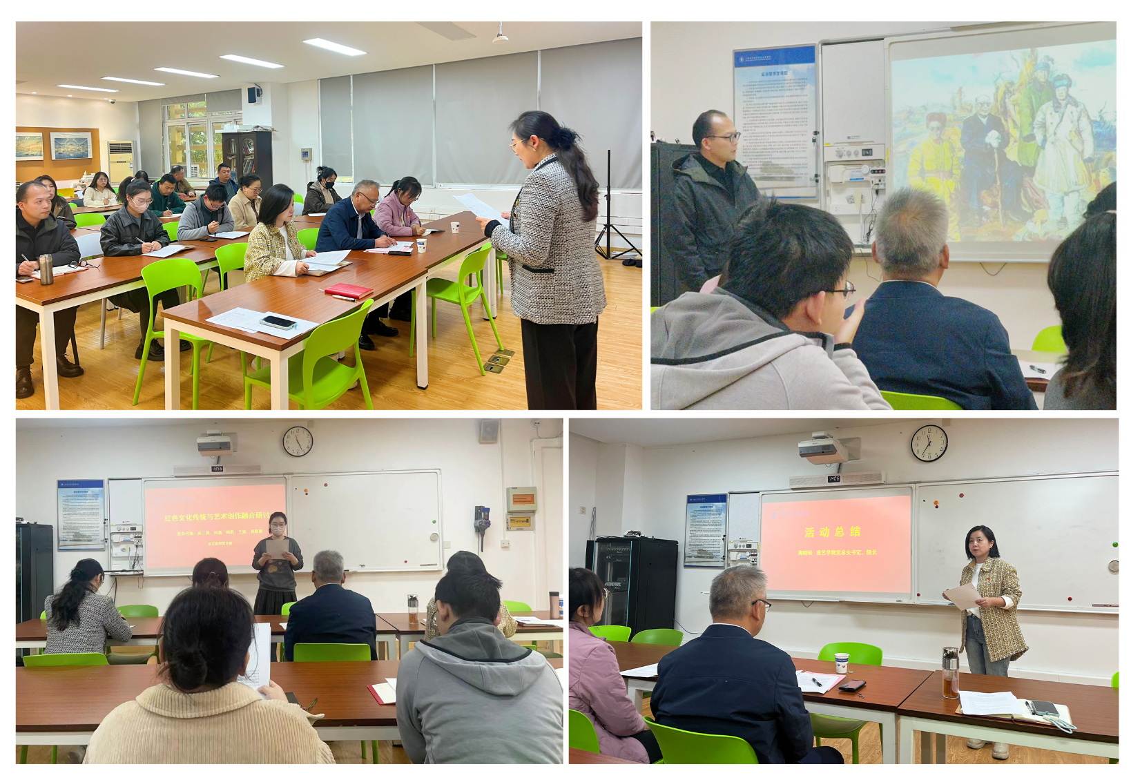 在专题研讨环节,围绕“红色文化与艺术教育融合路径”这一主题,多位教师分别从“红色主题艺术创作实践”“聚焦数字技术赋能红色传承”“经典红色符号与现代设计手法相结合的教学案例”“国产 IP 建模与传统文化故事、红色经典桥段相结合的教学模式”“让科研研究服务于红色文化传承”角度结合教学科研实践分享经验、交流心得,展现了红色文化在专业课程中的创新应用,为红色文化融入人才培养提供了多元思路。设计与艺术学院党总支书记、院长高晓昧总结强调理论学习是为了提高站位,推动成果转化服务于立德树人,激发组织活力促进融合发展。活动成功促进了跨学科交流与合作,为明年工作开展奠定了良好基础。